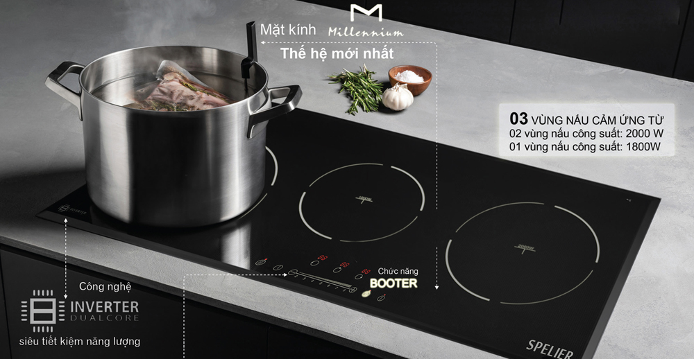 • 02 vùng nấu cảm ứng từ lớn công suất: 2000 W